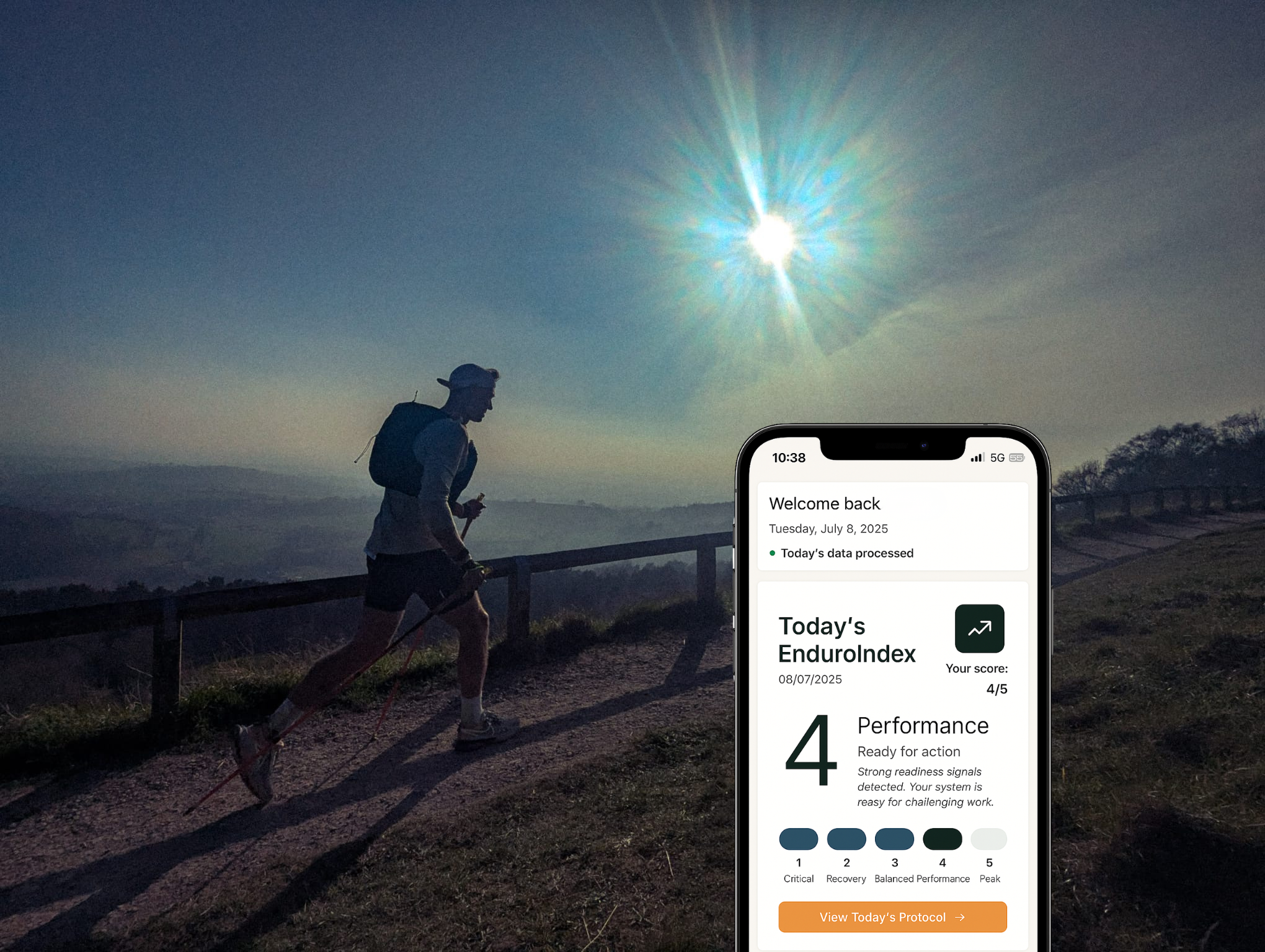 Your EnduroIndex™ score (1–5) instantly tells you how ready your body is to train, recover, or rest — and what action to take.