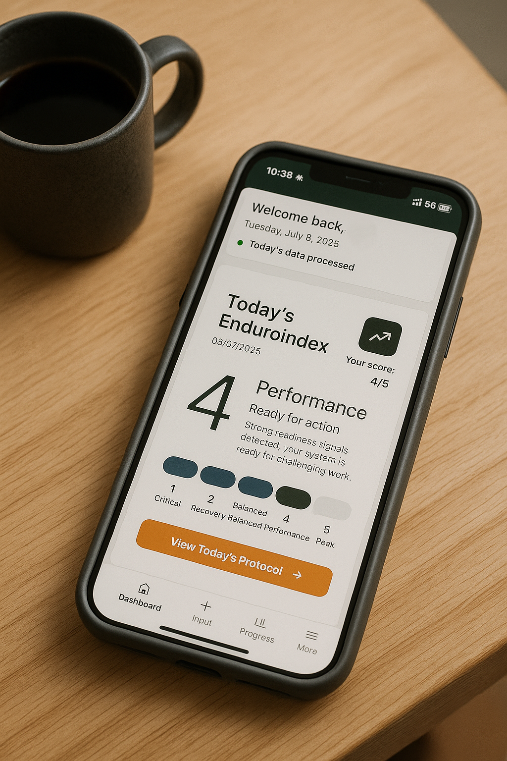 Your EnduroIndex™ score tells you where your body is at (1–5), and what to do next — from training protocols to recovery tools, to the exact supplement stack or shake your system needs.